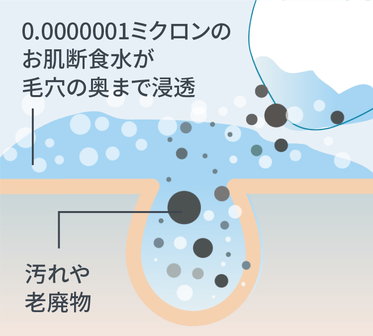 お肌断食水はナノサイズだから、毛穴に入り込んでとことん汚れを浮かせ、取り除き、クリーンな素肌に!